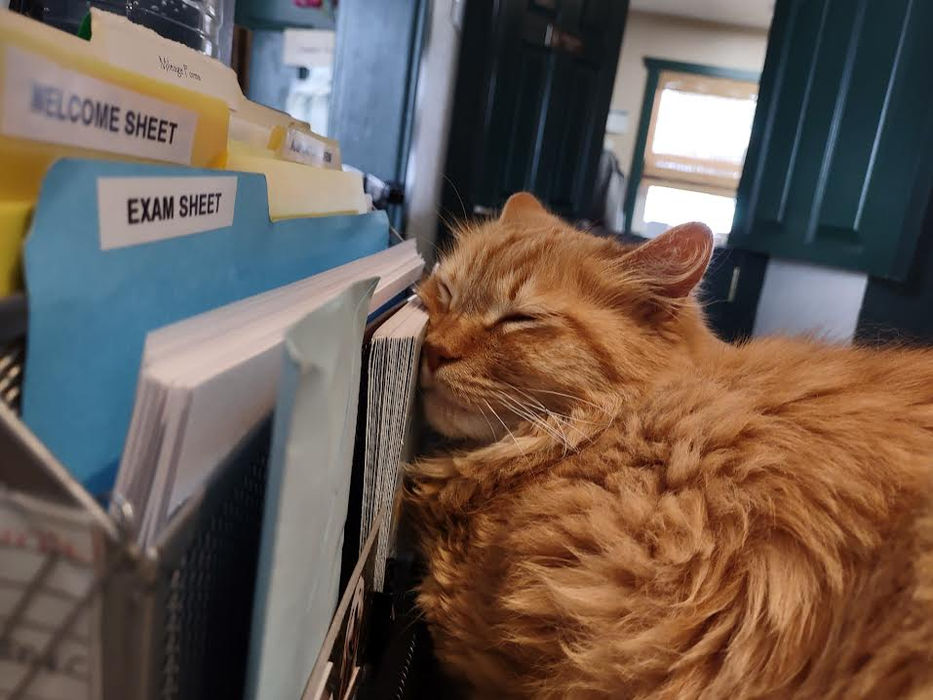 Meet Mango, full-time clinic resident, part-time menace, and acting mayor whether anyone voted for him or not. Mango lives at the clinic because he firmly believes it is his building, and frankly, no one has successfully argued otherwise. From his lobby counter basket—his official throne and surveillance station—he monitors all activity, oversees customer service, and ensures that every dog is personally welcomed into his jurisdiction. Dogs are friends. Dogs are voters. Cats are… evaluated.